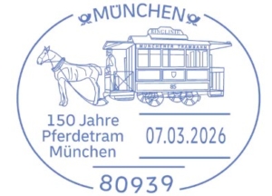 Die Münchner Philatelistenvereine gedenken der ersten Pferdetrambahn in München. Vor 150 Jahren fuhr die erste Pferdebahn vom Promenadeplatz zur Nymphenburger – / Maillingerstraße und markierte den Beginn des öffentlichen Nahverkehrs in München. Von 1895 an fuhren die ersten elektrischen Straßenbahnen, 1900 verschwanden die Pferdebahnen aus dem Stadtbild.