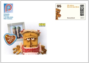 Am 4. September 2025 erschien eine Marke zu 95 Cent mit dem Thema „25 Jahre Bernd das Brot“, welche den Geburtstag des beliebten Fernsehhelden würdigt. Die Idee für „Bernd das Brot“ wurde in München geboren und daher gehört Bernd während der Philatelia ausnahmsweise nicht ins Weltall, sondern auf die Messeganzsache. In der für ihn typischen Art kann Bernd aber leider nicht so recht die Freuden des Oktoberfestes geniessen, obwohl er das hierzu passende Outfit trägt. Mit dem Lebkuchenherz macht er aus seiner Einstellung keinen Hehl …